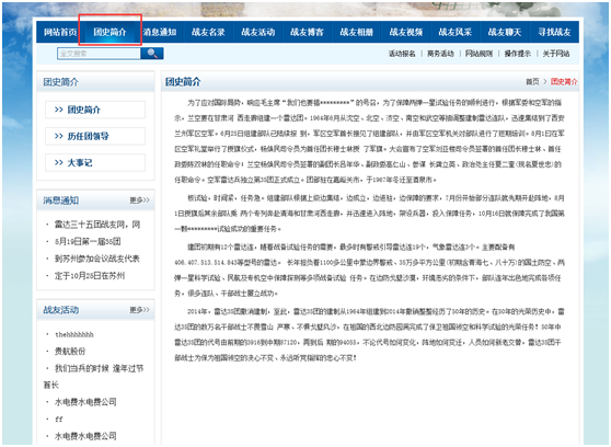 团史简介下有本团信息简介,历任团领导的相册及信息,本团的大事记信息展示。