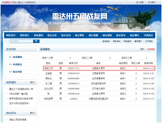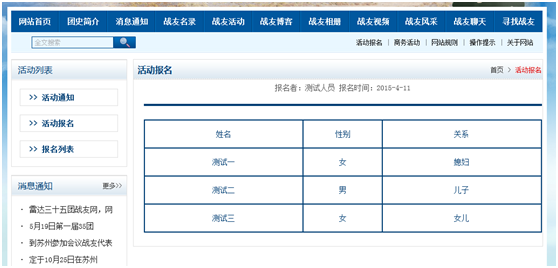 报名列表,可查看各个活动报名情况,各活动报名人数,随行人员人数,点击报名人员姓名,